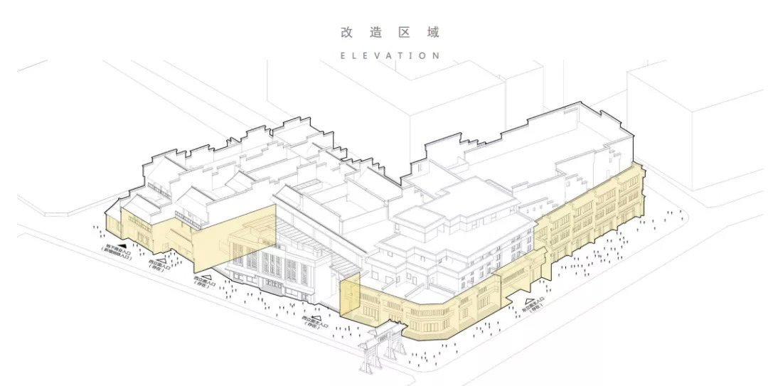 这个改造方案中,在动线规划上采用了一些棱角转折的方式,通过这样的动线规划将整个的街区动线划分成不同的建筑单元模块,以此模拟原生街区建筑错落,蜿蜒曲折的市井巷弄景象。