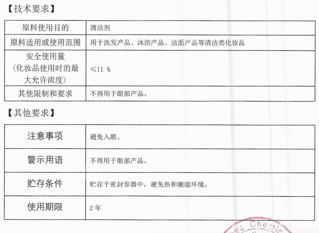 该款新原料的技术要求注明,其呈现为白色至灰白色薄片状固体,无味,使用目的为清洁剂,可以应用于洗发、沐浴、洁面等清洁类化妆品,使用时的最大允许浓度不超过11%。同时,该原料特别注明,不得用于眼部产品。