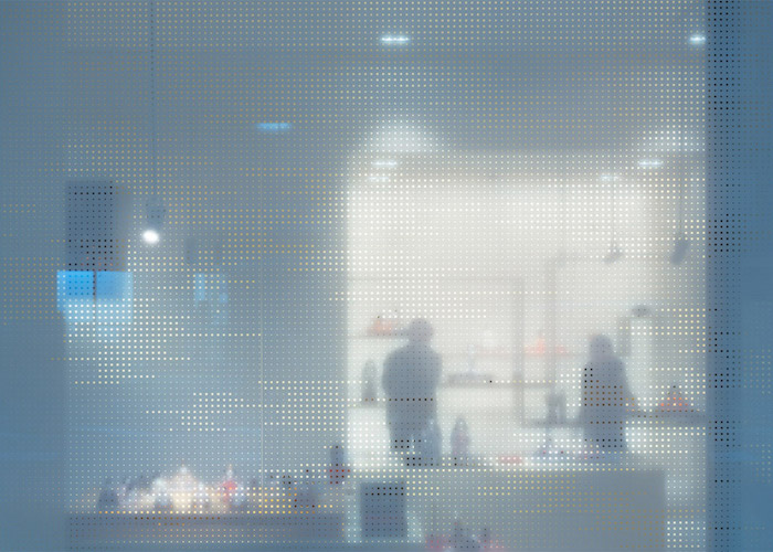 如果凑近磨砂玻璃看,还会发现造成磨砂效果的方法其实是在玻璃上点上了密集的波点。而波点本身也组成了图案,正是画廊深处无支撑展示架的模样。