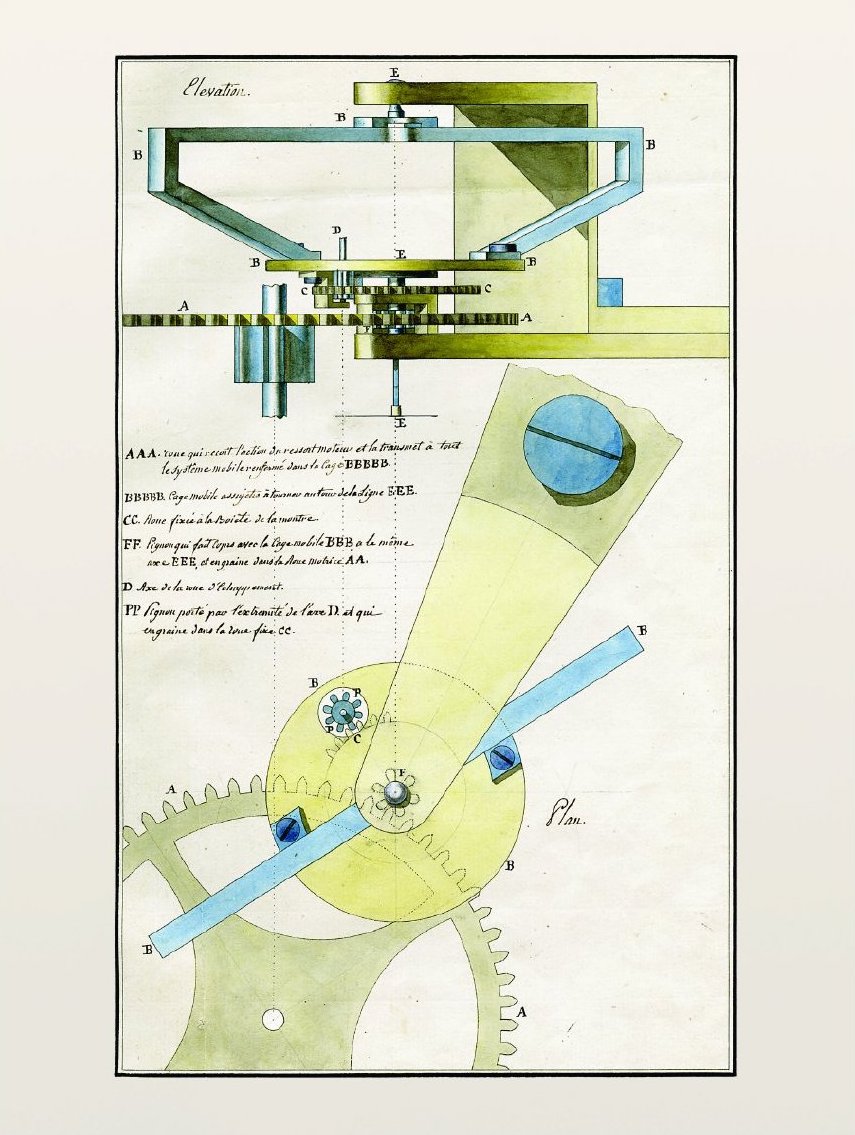 和恒定动力擒纵一样,陀飞轮也获得了法国国家工业产权局的专利注册证书。从至今仍然保存着的一张由宝玑先生绘制的陀飞轮调速器的水彩构造图中,人们可以直观地感受到精密的机械构造之美。