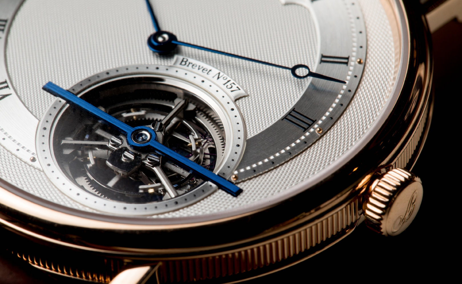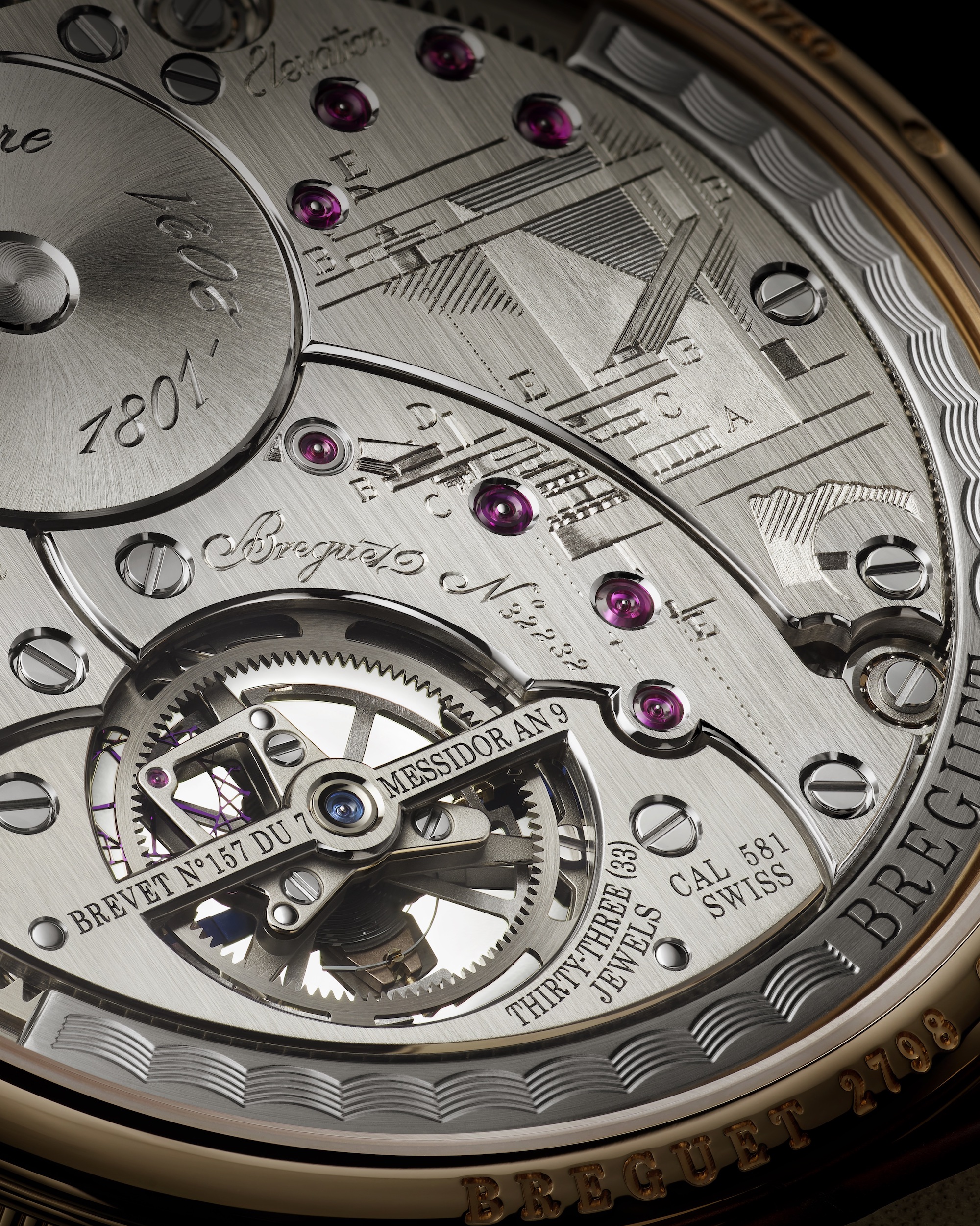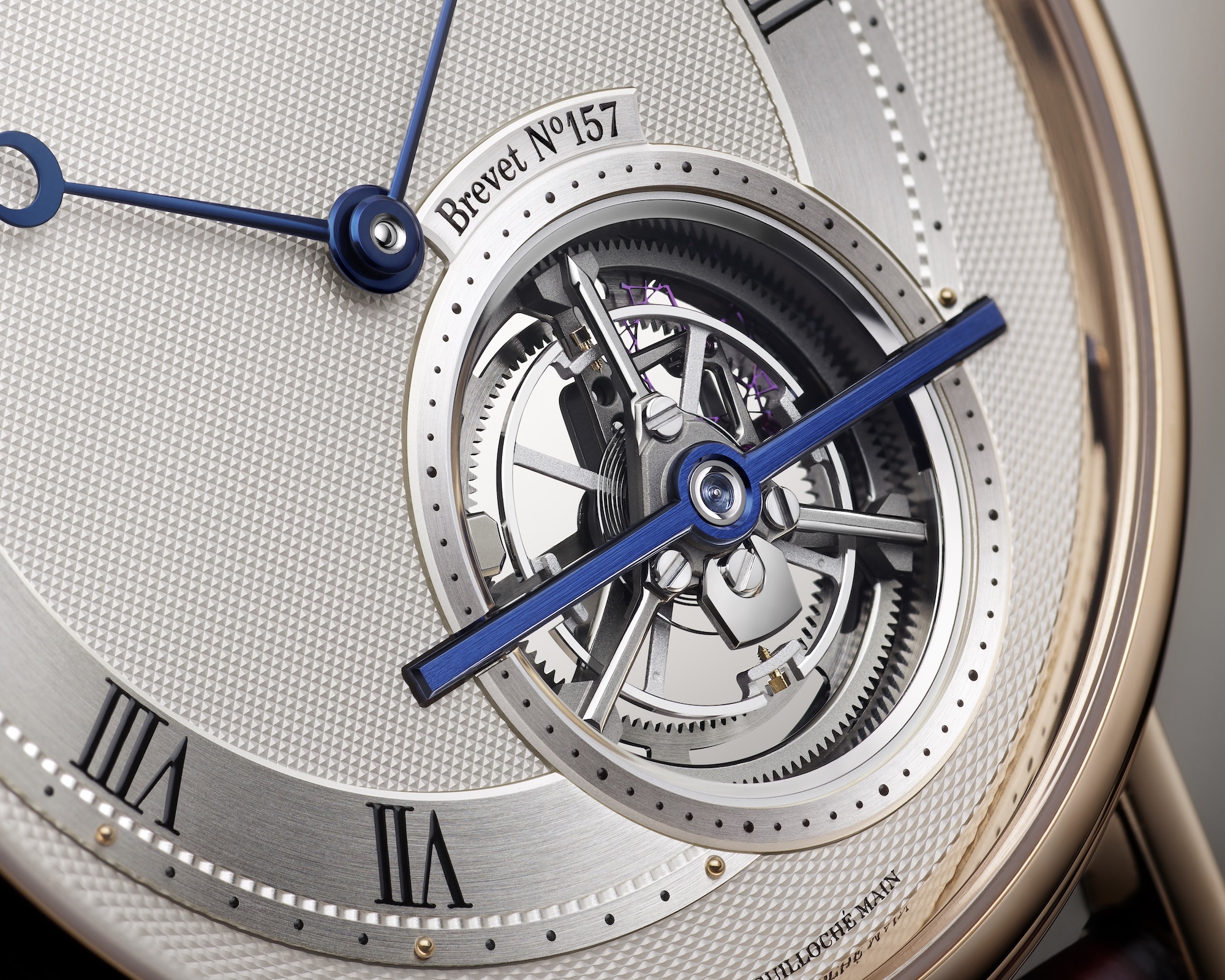 其它一望而识的标志还包括镌刻表盘上的独立编号和宝玑签名,采用罗马数字时标的刻度圈以及蓝钢宝玑指针。陀飞轮上方镌刻着“Brevet N° 157”字样,是宝玑先生所获陀飞轮专利的编号。