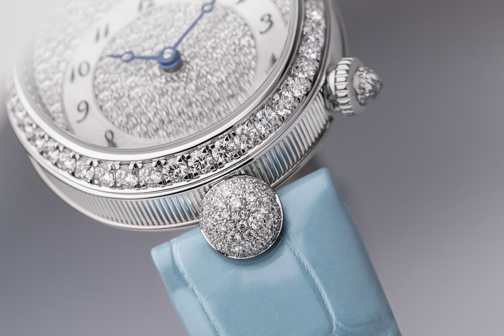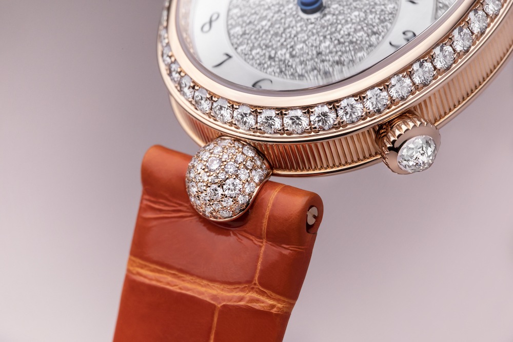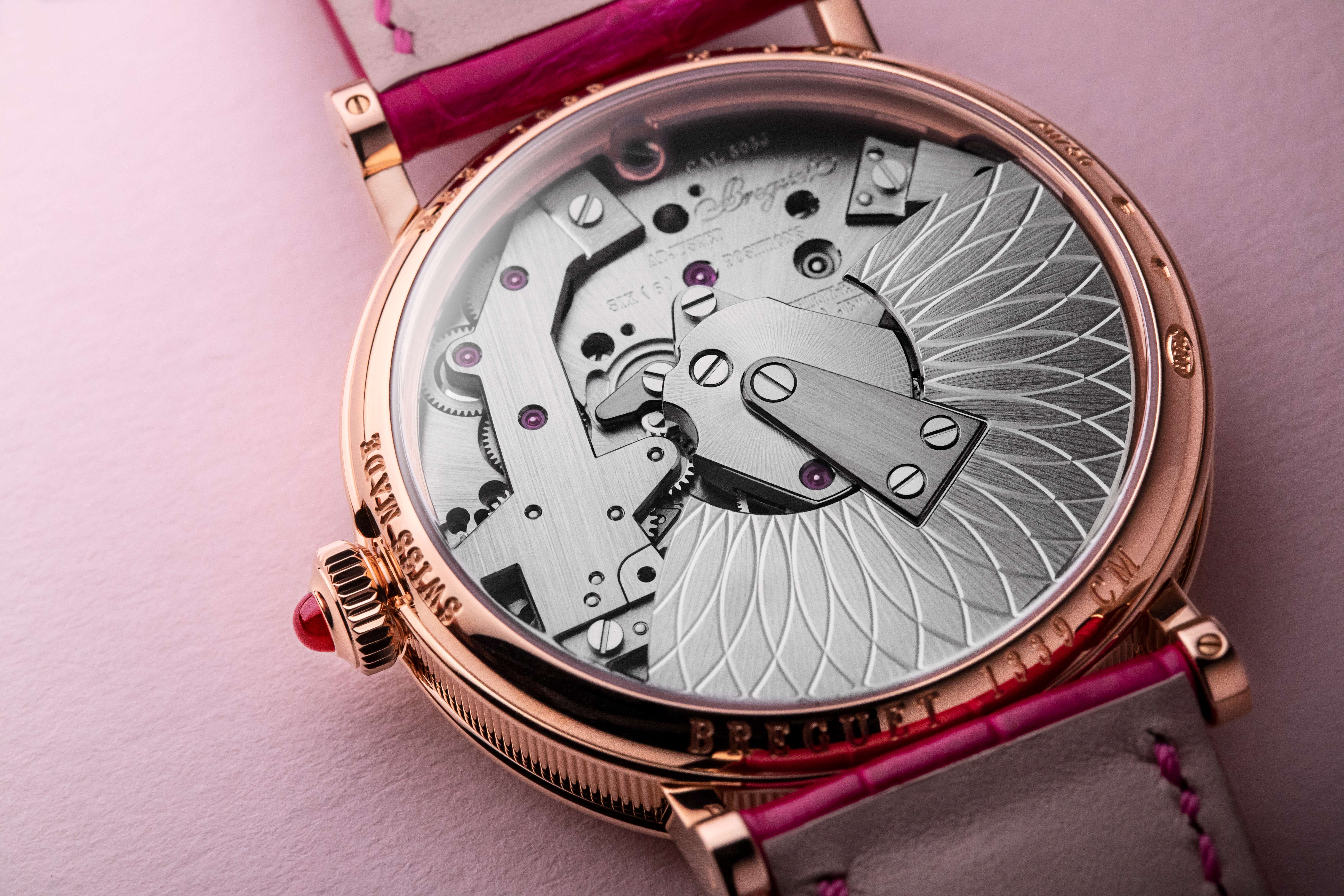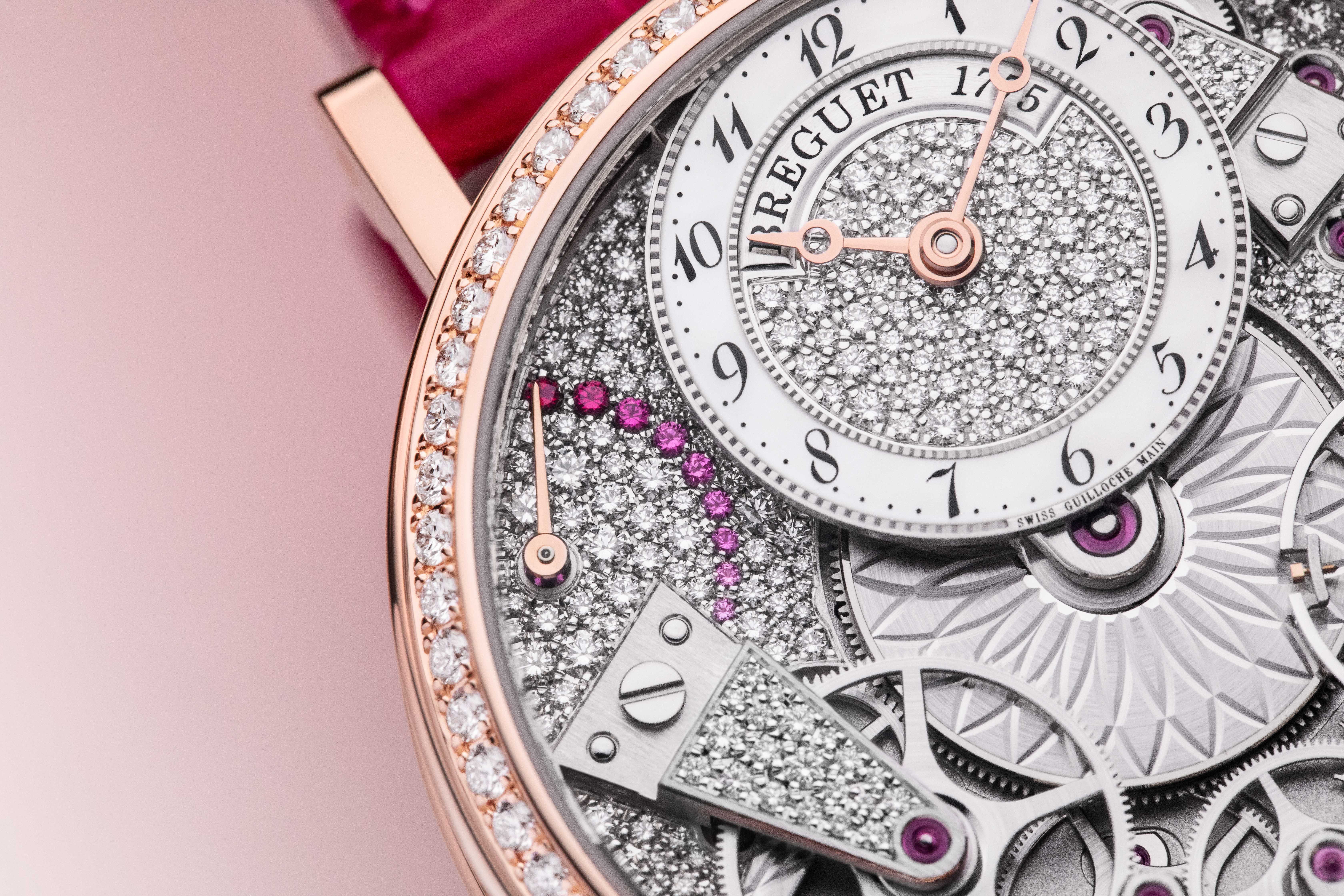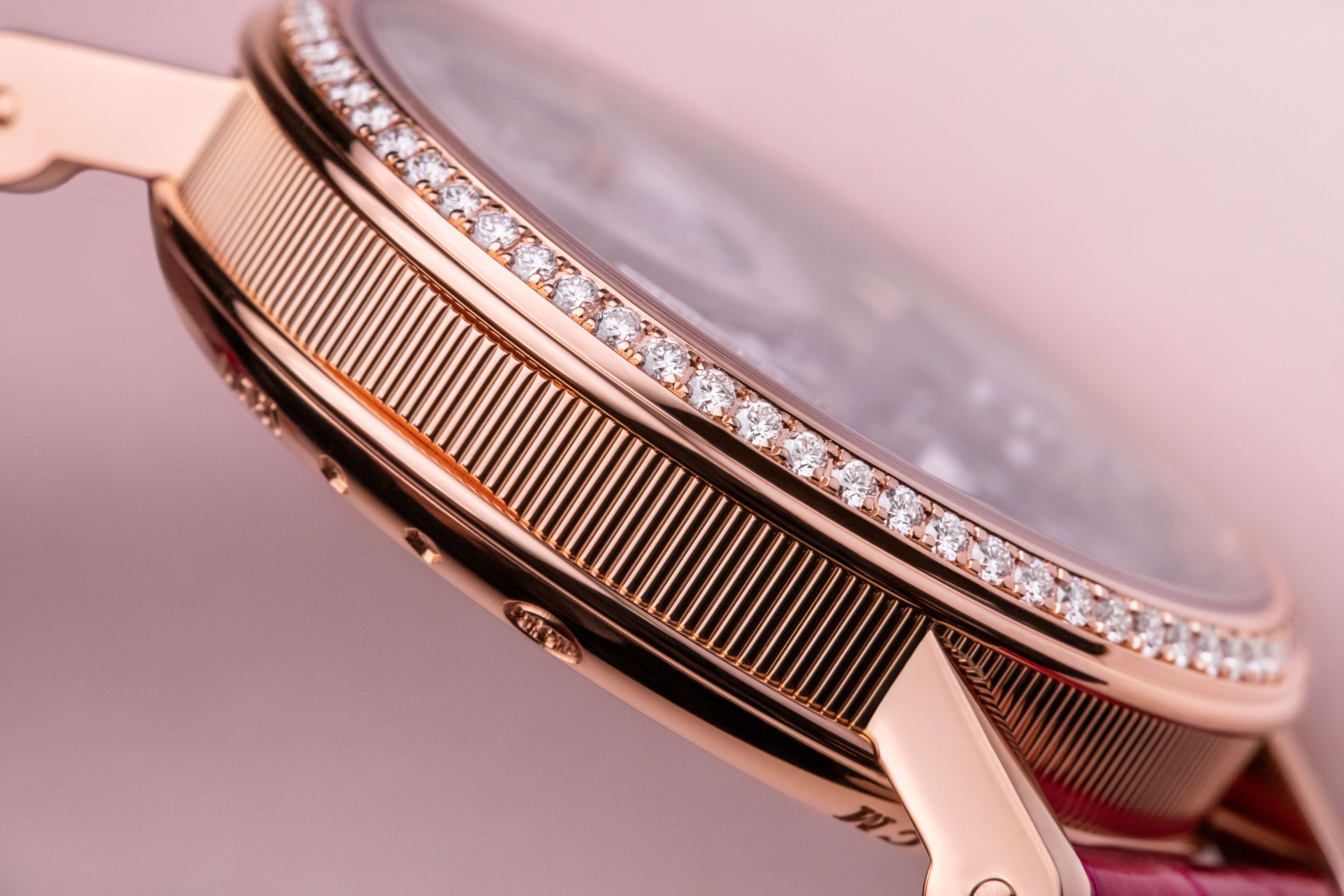 宝玑工匠使用雪花镶嵌工艺将68颗约0.819克拉的明亮式切割钻石环绕镶嵌于玫瑰金表壳外围,并在表冠处镶嵌一枚约0.16克拉的红宝石作为点睛之笔。