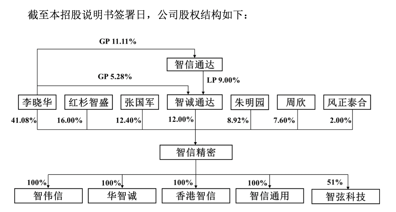 IPO前,李晓华直接持股41.08%,并通过担任智诚通达(员工持股平台)普通合伙人、执行事务合伙人间接持股12.00%,因此合计控制公司53.08%股权,为公司控股股东、实际控制人;此外,外部股东红杉智盛持股16.00%、风正泰合持股2%。