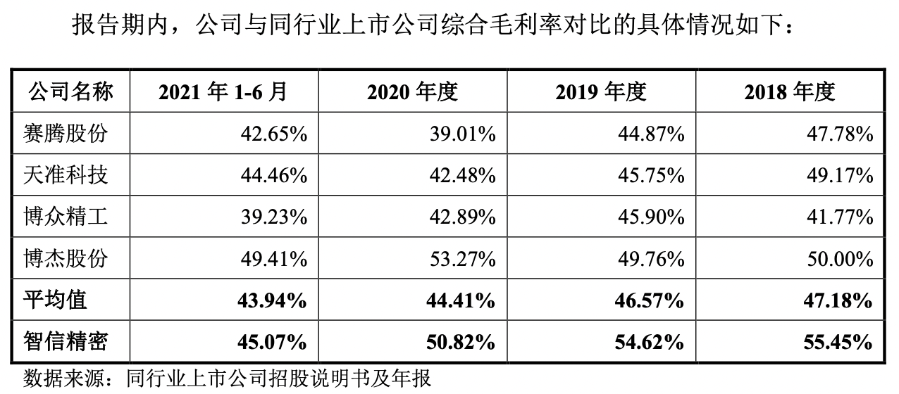 值得注意的是,纵向而言,智信精密自身毛利率却在逐渐下滑,2018年-2021年上半年,公司综合毛利率分别为55.45%、54.62%、50.82%、45.07%。同样兴禾股份也面临毛利率下滑的问题,2018年-2021年上半年综合毛利率分别为51.48%、58.58%、49.65%和39.33%,为此毛利率波动等相关问题也被监管层发问。