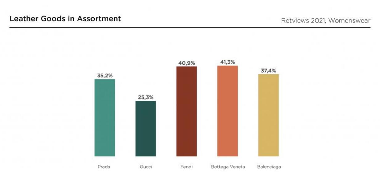 根据Lectra Retviews的数据,Fendi 40.9%的产品是皮具,略低于 Bottega Veneta,后者的皮具在所有产品中占比41.3%。Balenciaga的占比是37.4%,Prada占35.2%,Gucci占25.3%。Fendi的配饰选择非常广泛,从小皮具、小珠宝袋,到围巾、帽子等更便宜的商品都有,因此在奢侈品市场上,Fendi是价格范围最广的品牌之一。