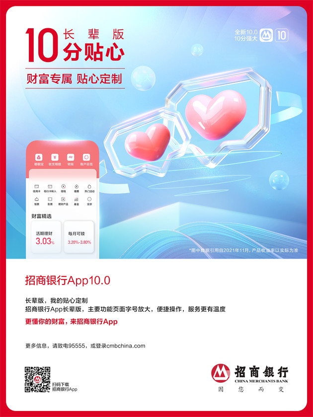 针对年长客户,10.0版本进行了有针对性的适老化改造,暖心上线“长辈版”。该版本对App五大频道页和转账、收支、账户总览、缴费等年长客户常用的界面进行了改造,页面字号更大,让年长客户看得更清楚,使用更容易。同时,优化“丰润人生”专区,在功能之外给年长客户更多有针对性的投资产品与内容资讯。
