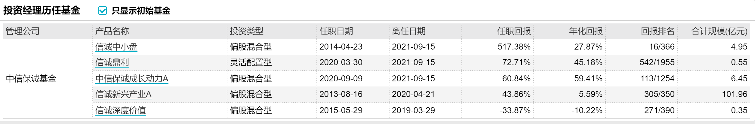 从此前管理的5只基金业绩来看,Wind统计数据显示,仅信诚深度价值任职回报为负,担任基金经理5年最终回报率为-33.87%,基金规模也十分“迷你”,仅0.35亿元。