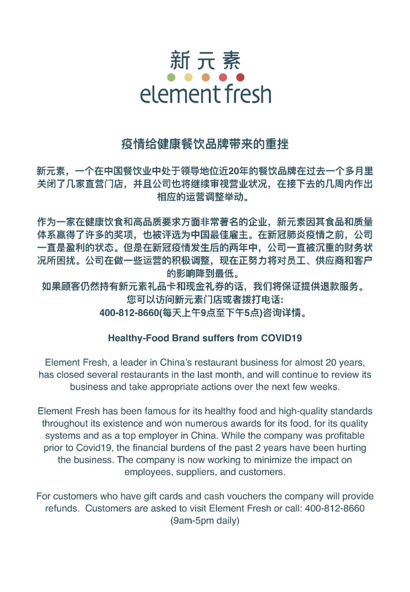 上述声明同时强调了疫情给品牌带来重挫,称在疫情以前公司一直是盈利状态,但在近两年,新元素一直被沉重的财务状况所困扰。