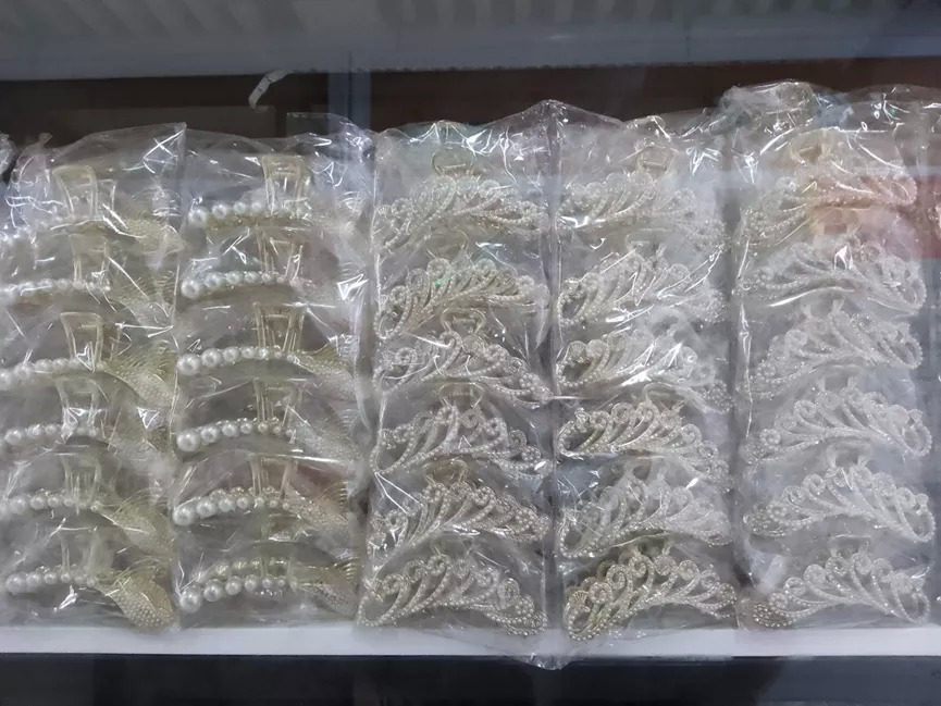 发夹被摆在门口。路过的一个小女孩看到后,拉着妈妈的手走到跟前,拿起一对发夹,认真地端详发夹上红色的鹿角。