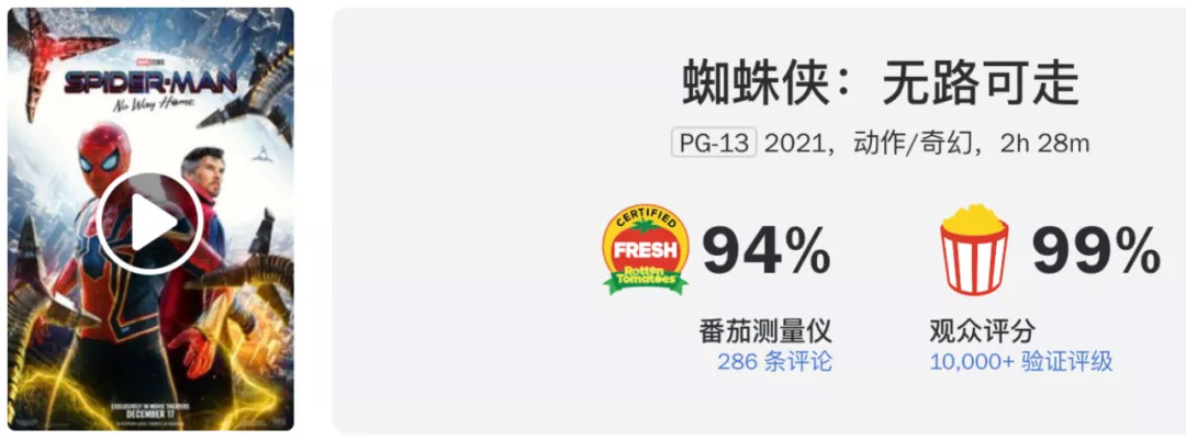 另外,影片是蜘蛛侠系列中口碑最好的一部,这也是它能够拥有良好市场走势的原因。目前影片烂番茄拿到了惊人的94%,成为历届《蜘蛛侠》电影中最高,而爆米花指数更是达到了99%,证明了观众是多么的喜爱。将它放在漫威宇宙横向对比,依然是最为顶级的口碑。