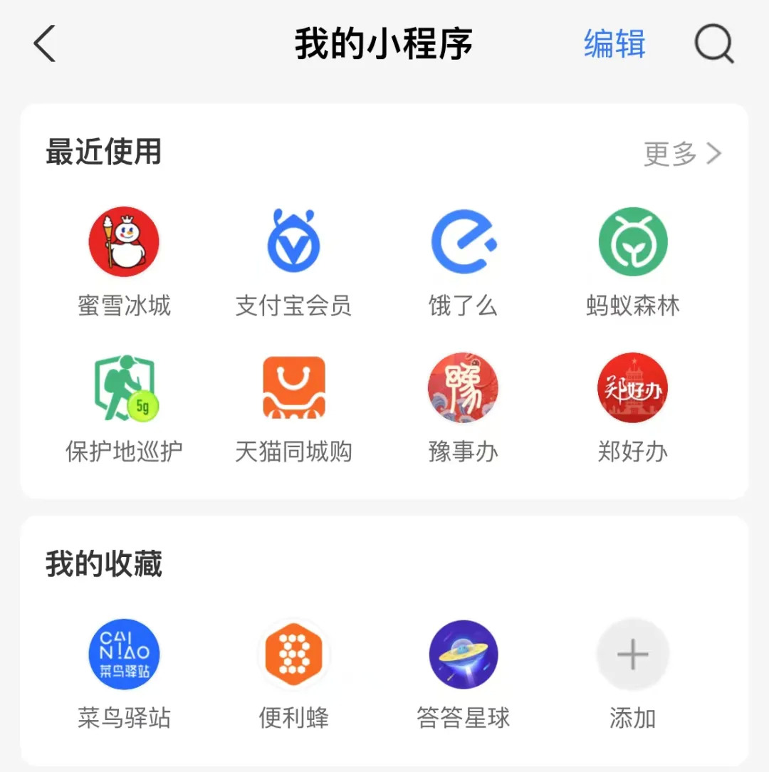 我发现,支付宝的首页现在有了一个“我的小程序”入口,点进去就能找到最近使用过或者收藏过的小程序。这能很好地吸引人再次点进去、给商家带来复购。