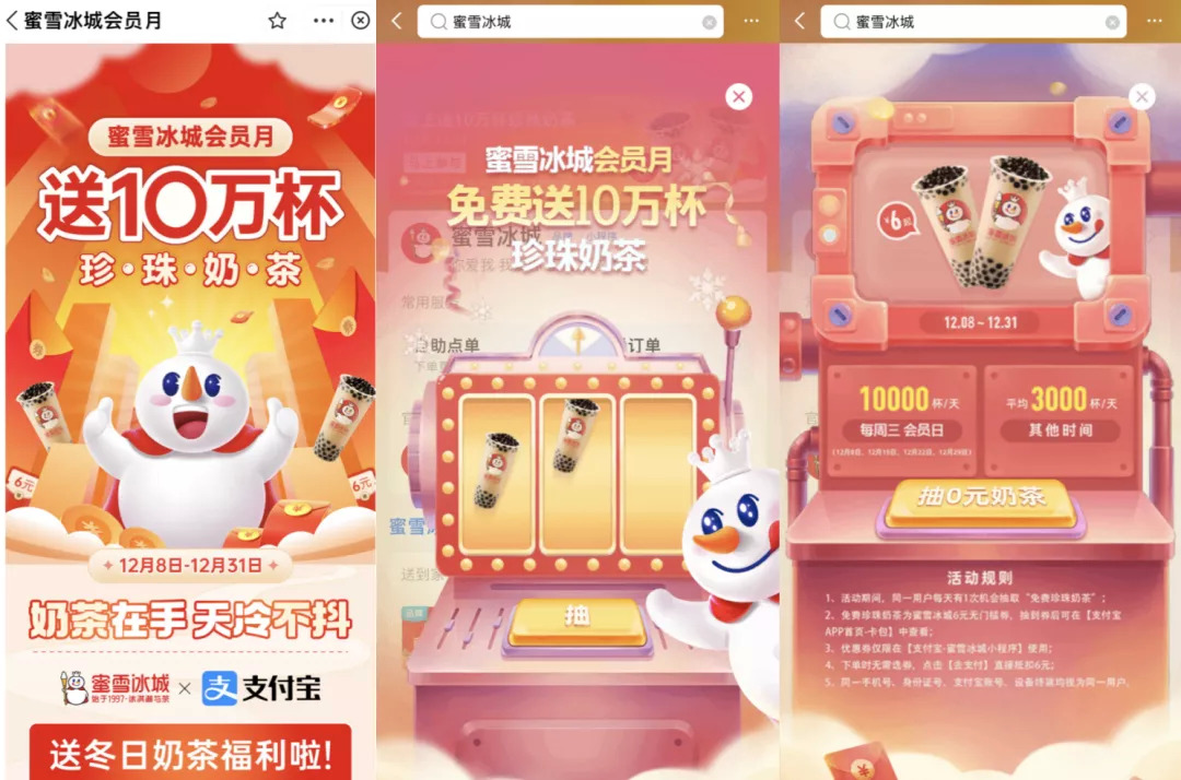 据了解,这是蜜雪冰城专门在支付宝小程序里推出的“会员月”活动,打出“雪王送10万杯珍珠奶茶”标签,要在12月8日~31日期间送出10万杯奶茶。