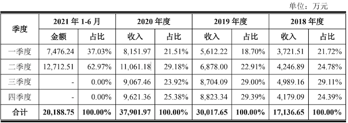 值得注意的是,同期公司净利润分别为774.02万元、3809.50万元、6210.80万元和3456.80万元。由于钜泉光电的销售收入不存在明显的季节性变化,2021年上半年公司净利润占去年全年的比例为55.66%,因此仍然面临着业绩下滑风险。
