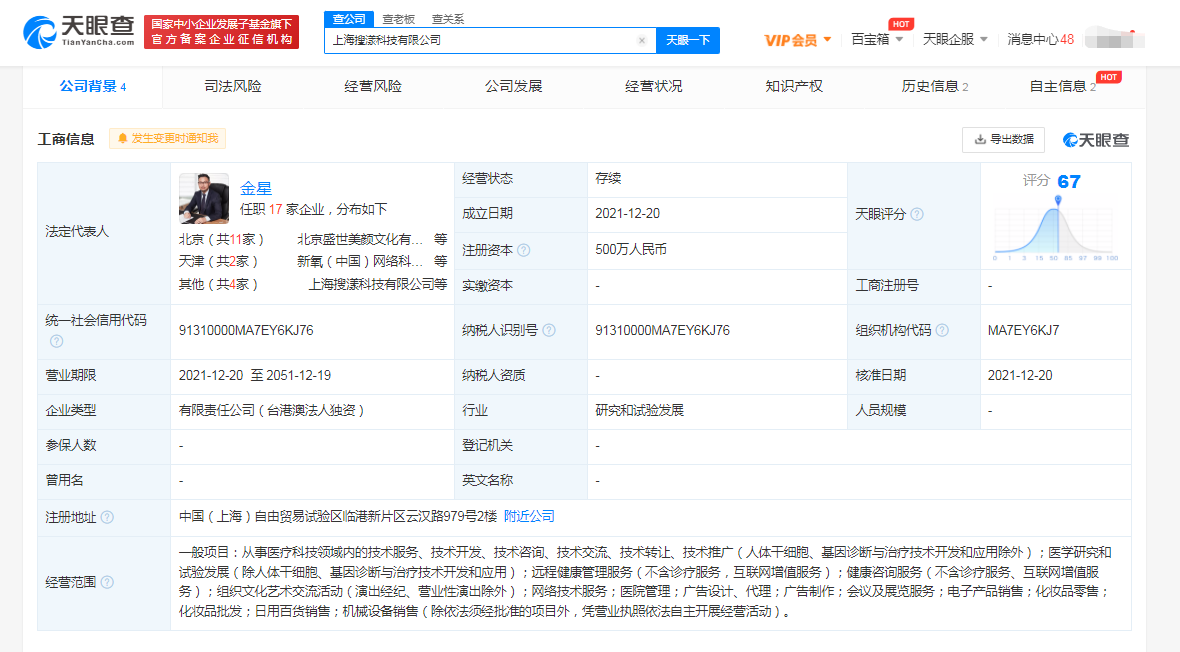 天眼查App显示,12月20日,上海搜漾科技有限公司成立,法定代表人为金星,注册资本500万人民币,经营范围包括远程健康管理服务;医学研究和试验发展;从事医疗科技领域内的技术服务等。股东信息显示,该公司由新氧香港有限公司(So-Young Hong Kong Limited)全资控股。