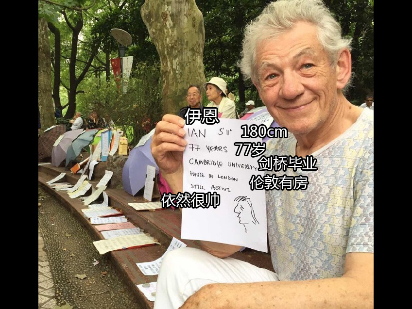 “万磁王”伊恩爷爷最近在北京上海两地到处游玩,引来了无数群周围观。11日下午,他又去了上海著名的爱情圣地人民人民公园,混迹在一票老头老太之间为自己相亲。他列出的条件也是无敌了。▼