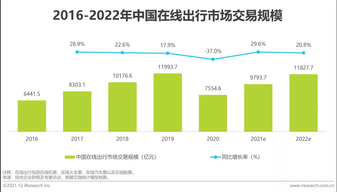 2020年受疫情影响,中国在线出行市场交易规模同比下滑37.0%;在疫情态势缓和、防控措施完善等因素影响下,出行市场逐渐实现部分恢复,预计2021年市场规模将同比增长29.6%。