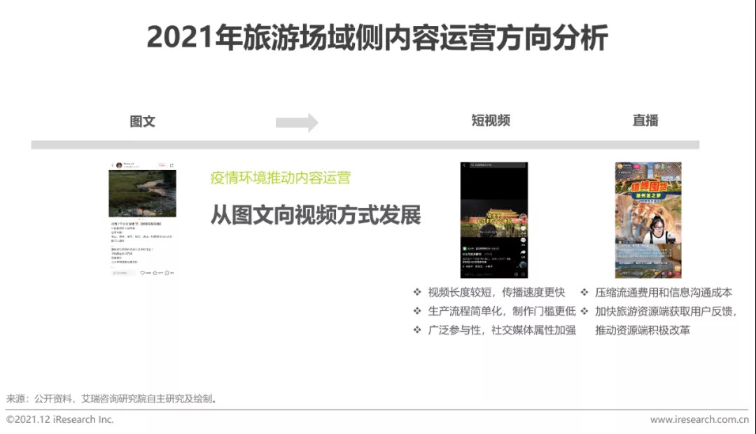 在疫情的影响下,旅游行业的内容运营方式逐渐呈现从图文到视频的发展趋势。相较于图文,短视频和直播这两种视频的内容运营方式更能推动旅游供需链路中触达效率的提升。