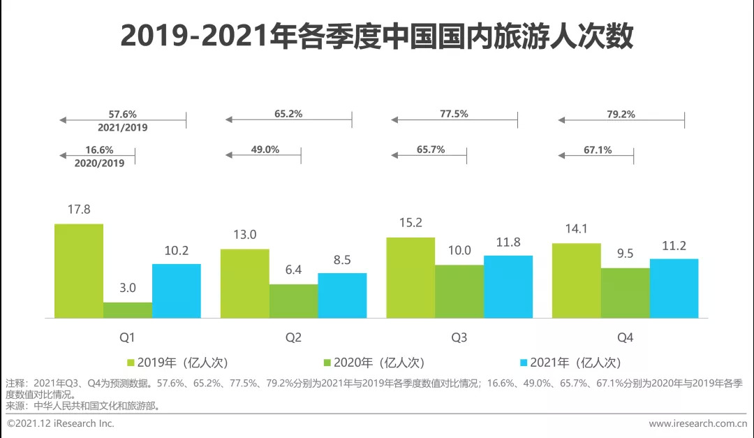 2021年Q1-Q4中国国内旅游人次数分别恢复至2019年的57.6%、65.2%、77.5%和79.2%,市场保持向好趋势;
