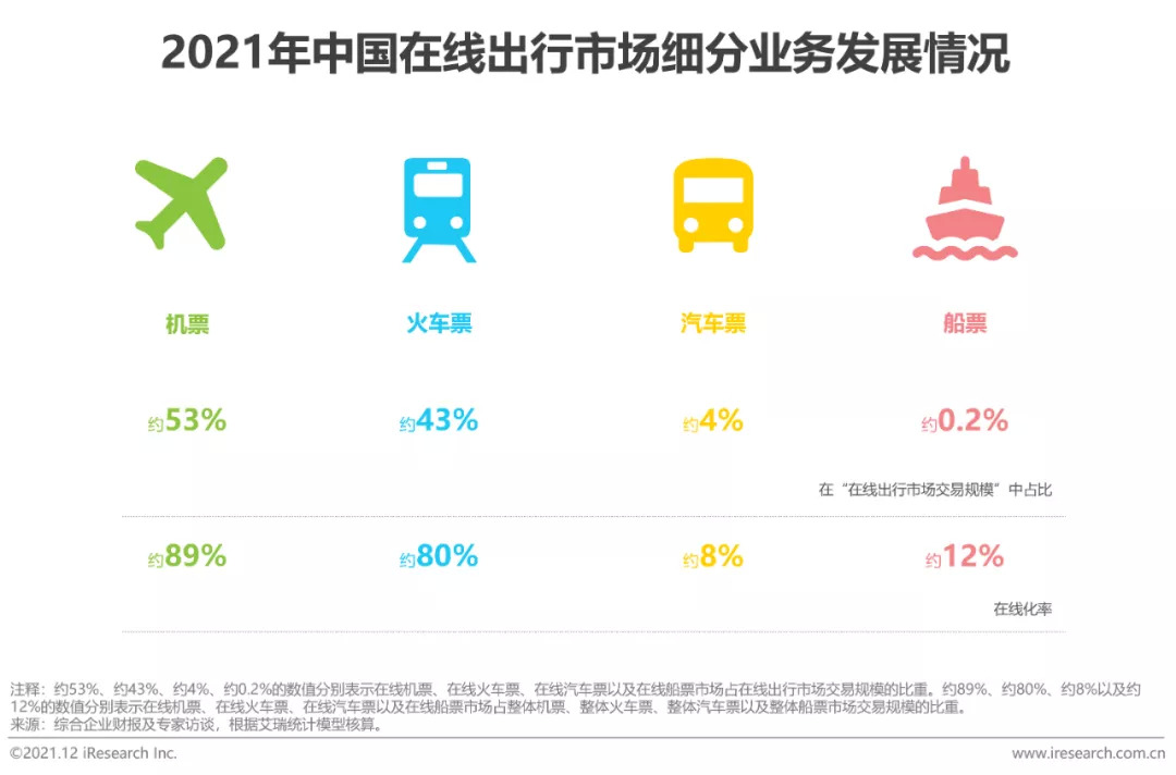 在线出行市场中,机票、火车票是其中最大的两个细分市场。预计在2021年,在线机票、火车票、汽车票和船票的市场交易规模将分别占在线出行市场交易规模的约53%、43%、4%及0.2%。