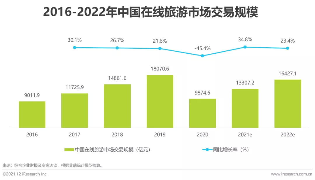 2020年:新冠肺炎疫情环境下,旅游市场受到巨大影响,中国全年在线旅游市场交易规模同比下降45.4%。