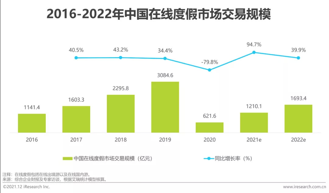2021年:国外疫情形势依旧严峻,短期内出境游恢复较难;国内疫情总体可控,但零星散发病例时当地出行、旅游等活动通常会紧急叫停,对旅游业恢复的节奏造成一定影响;同时,年内极端恶劣天气频发,景区的运营、游客的出行等均受影响。因此,预计2021年在线旅游市场交易规模相较2020年较难实现强劲复苏,同比增长34.8%。