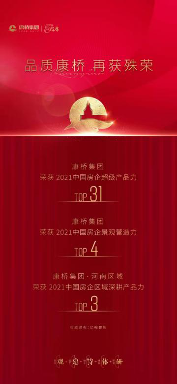 2021年康桥再一次荣登中国房地产百强企业、2021中国房企超级产品力TOP31、2021中国房企景观营造力TOP4等一系列殊荣,这是行业对康桥企业规模、盈利能力、融资能力、发展潜力、运营效率、社会责任感等领域的认可,也是无数客户对康桥产品力、服务力、运营力的赞誉。