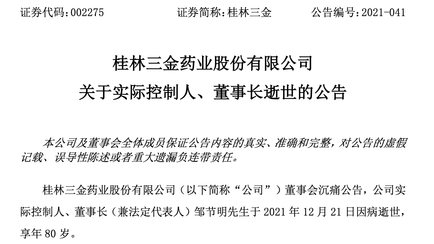 12月22日午间,桂林三金公告称,公司实际控制人、董事长(兼法定代表人)邹节明于2021年12月21日因病逝世,享年80岁。