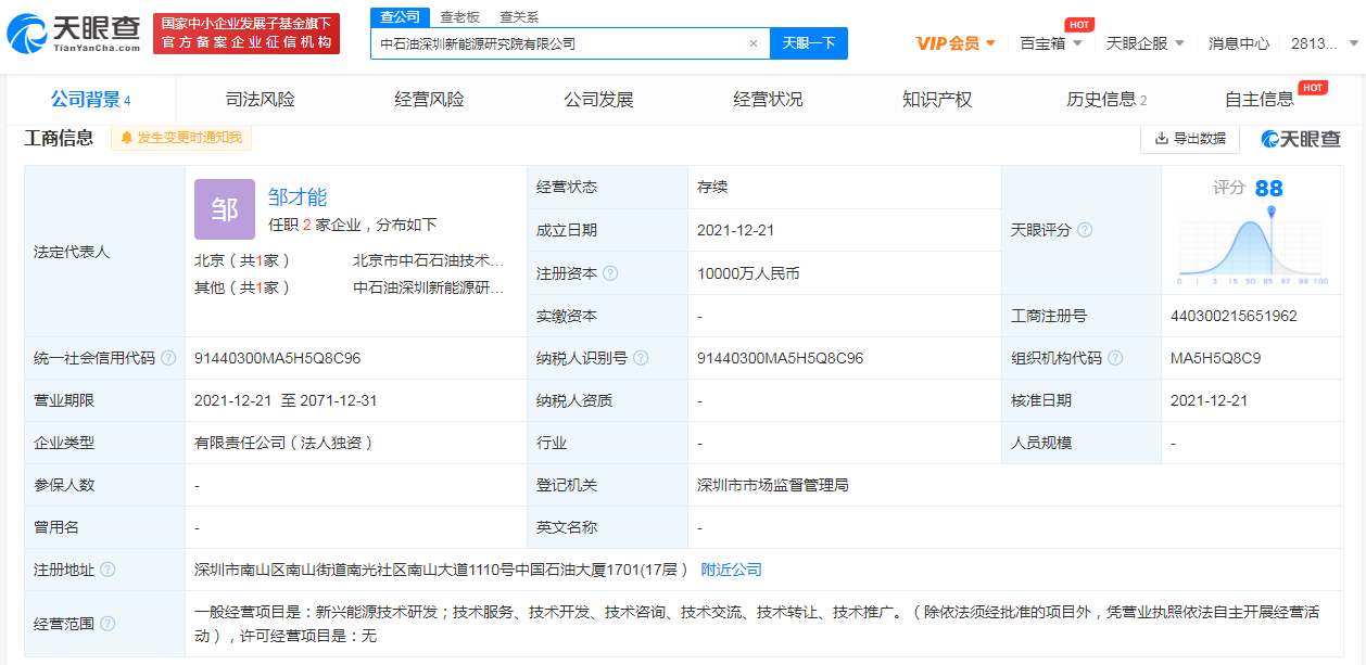 据天眼查App显示,近日,中石油深圳新能源研究院有限公司成立,注册资本1亿人民币,法定代表人为邹才能,经营范围含新兴能源技术研发;技术服务、开发、咨询、推广等。股东信息显示,该公司由中国石油天然气股份有限公司全资持股。