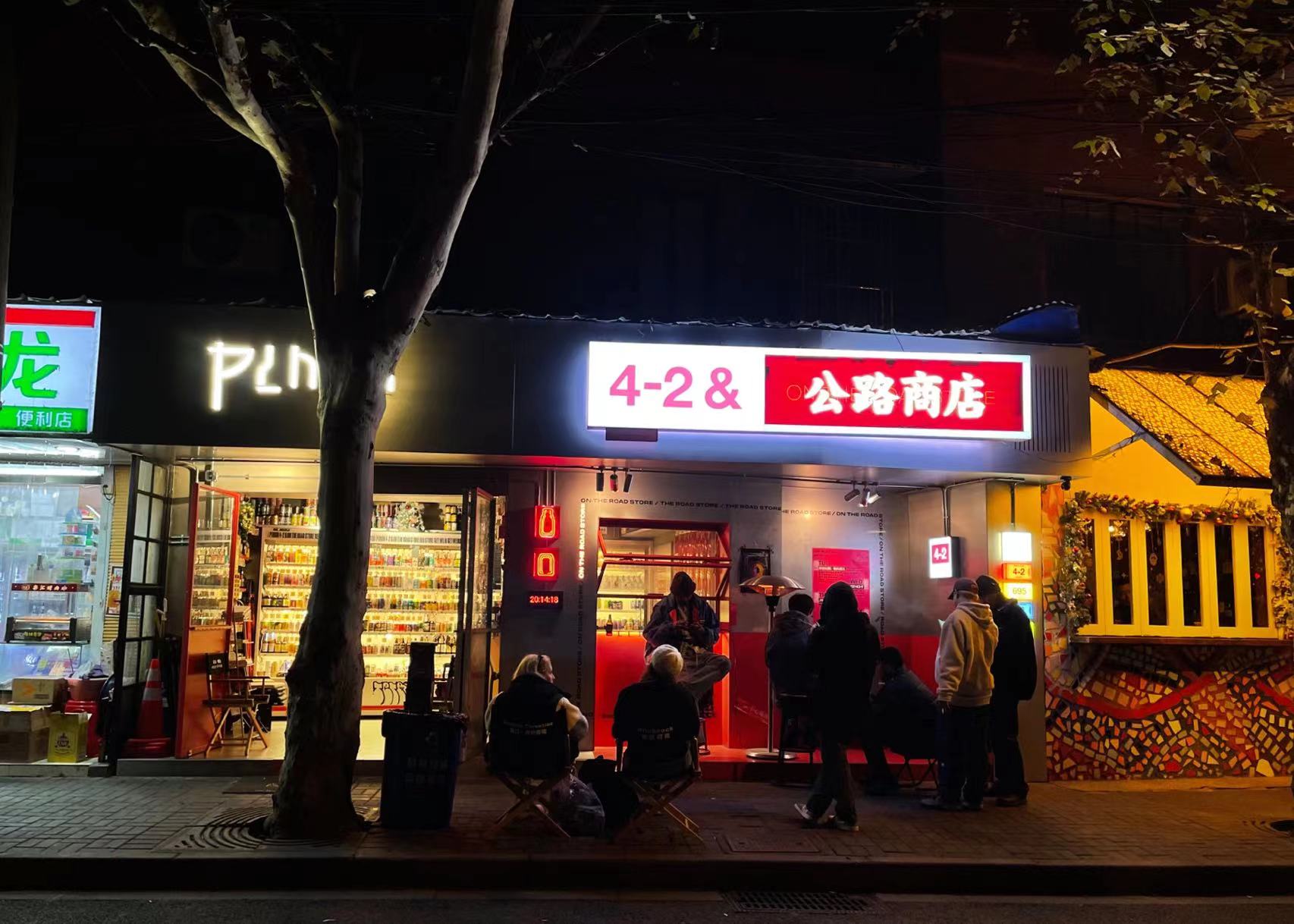 上海的梧桐树下早已成为贩卖生活方式的好地方。以公路商店为代表的酒便利店利用其特色的路边喝酒的模式,使城市商业重回街区,不仅丰富了经济形态,而且为城市增加了一份别样的夜间烟火气。