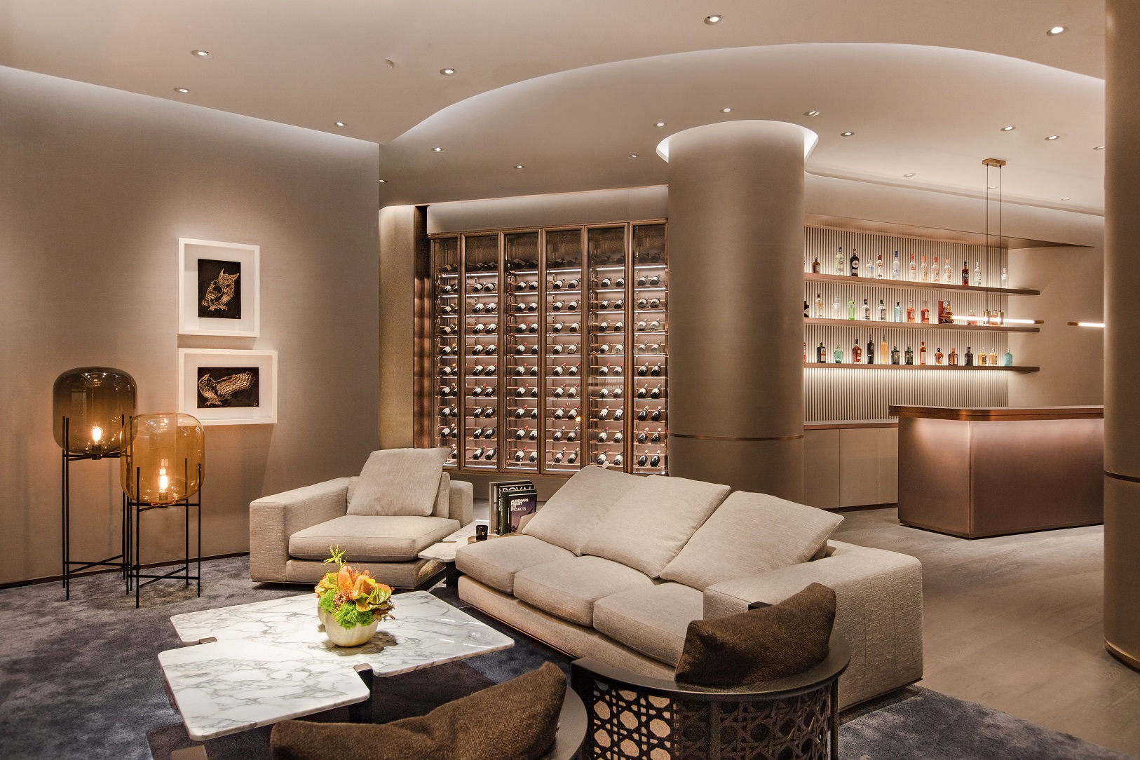 上海AP House共有两层,一楼为爱彼腕表时计的商品展示区,二楼则为中西元素融合的现代风格专属空间。该空间规划有酒吧台、雪茄吧、餐厅和会客厅等不同功能空间,给客人营造出一种家中聚会的亲密感。