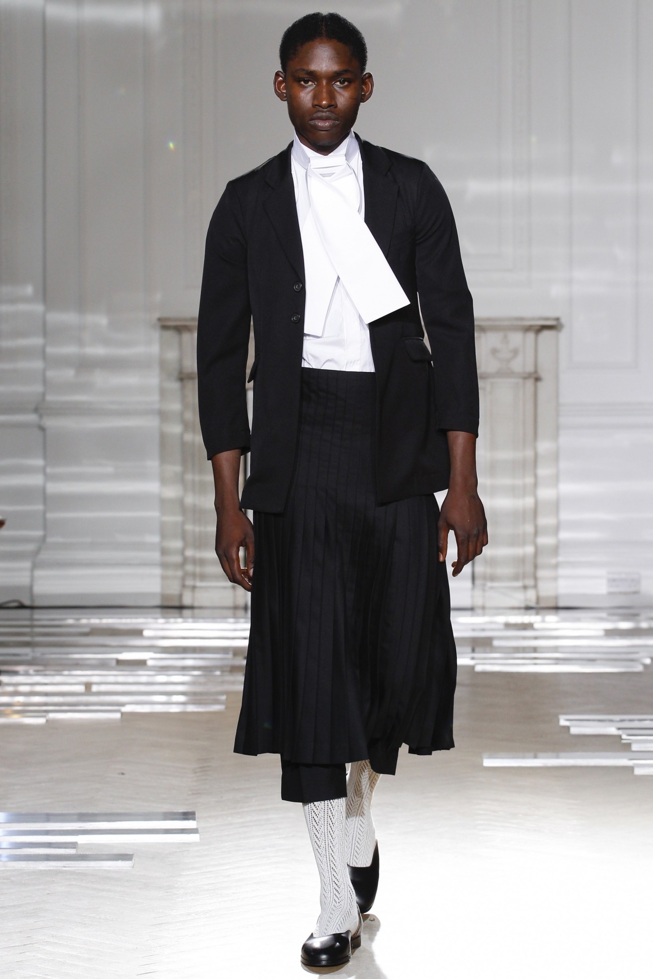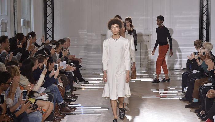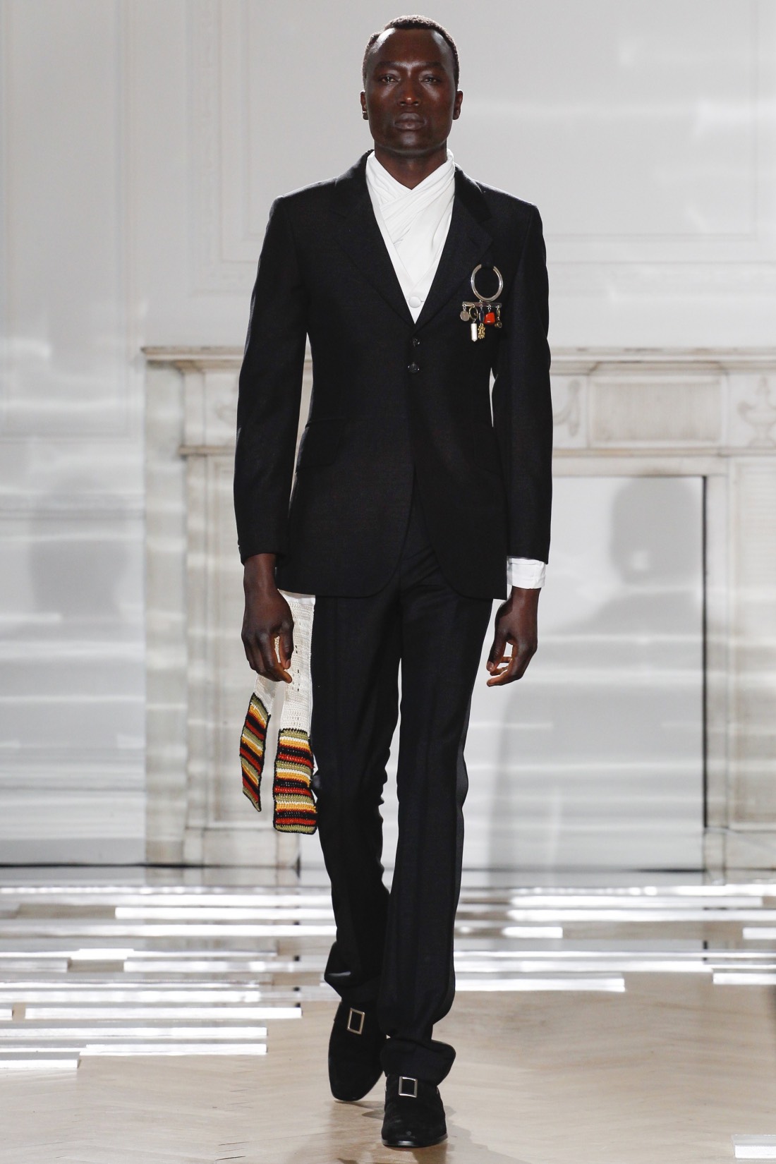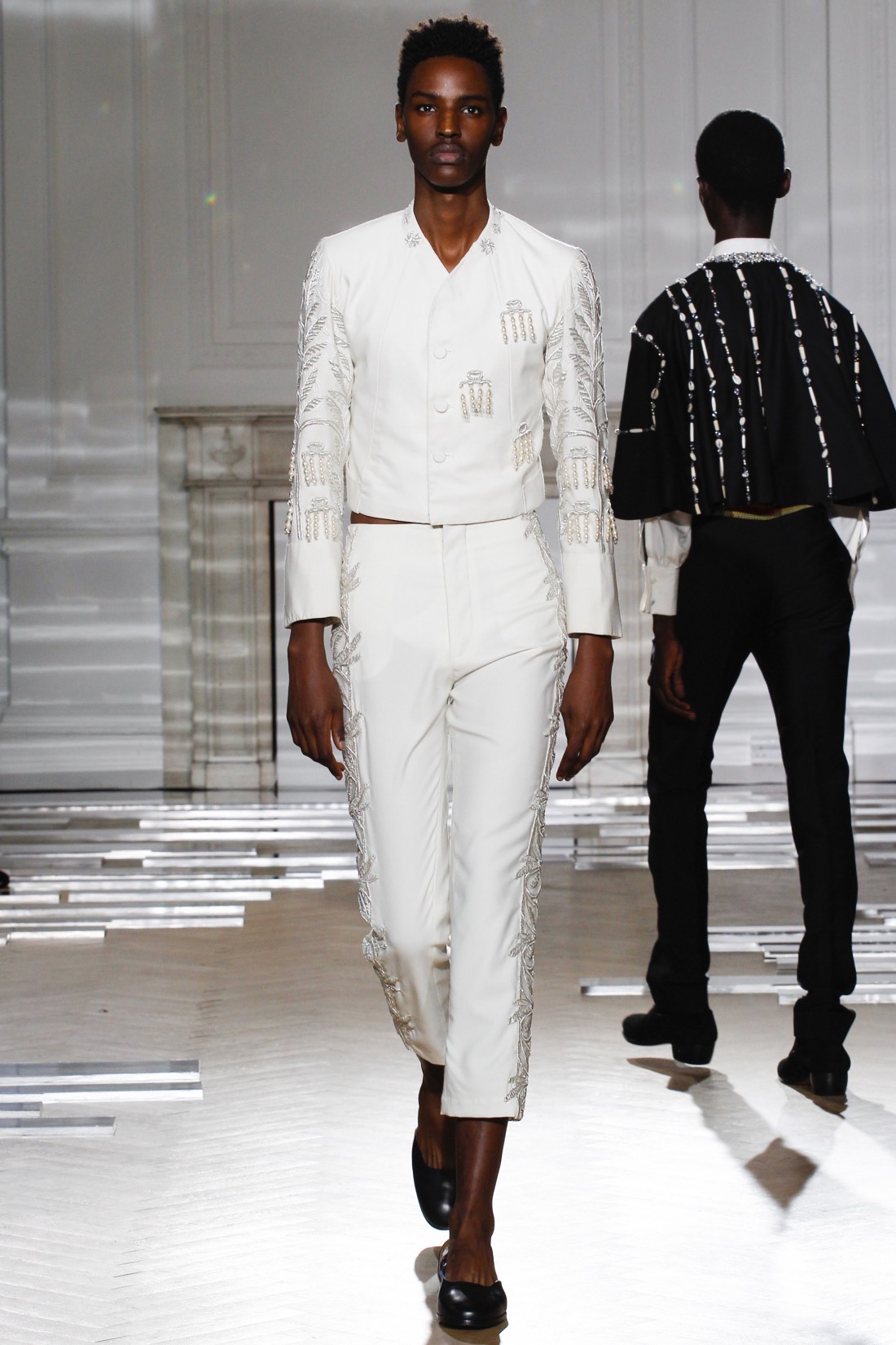 正是因为这种推小车式的力荐,让前几季还只是作为Fashion East孵化器下初试啼声的Grace Wales Bonner在本季正式走上了伦敦男装周的大舞台。2017春夏系列男装是她出道以来第五个系列,名为“Ezekie”(以西结,圣经记载的一位先知)。和Criag Green刚刚发布的童子军系列一样,Grace Wales Bonner的新作更像是对前期作品的一次完善与更新,可谓是根据过往而升级的“2.0”版本:总共22套新装保持了她将牙买加、加勒比,非洲糅合欧洲宫廷元素的做法,统治埃塞俄比亚长达44年之久的海尔塞拉西的历史照片同样悬挂在本季的灵感板上,并化身为缀有珠宝的无领夹克、迷你斗篷,高腰七分裤,天鹅绒裤式套装等精致单品。此外,女模特的出现,一方面象征了中性化的做法,一方面也是因为像Opening Ceremony这样从前两季便订货的零售商一直将其产品归类为女装试水,所以这次便索性干脆推出女装。