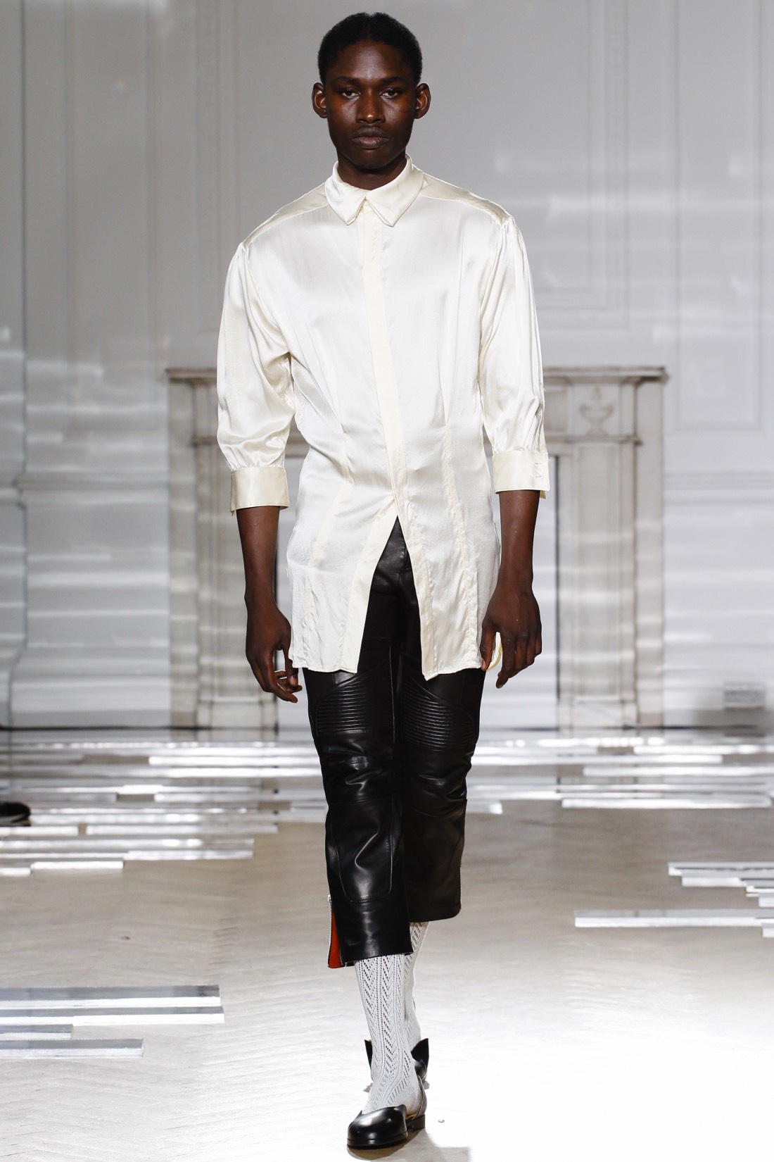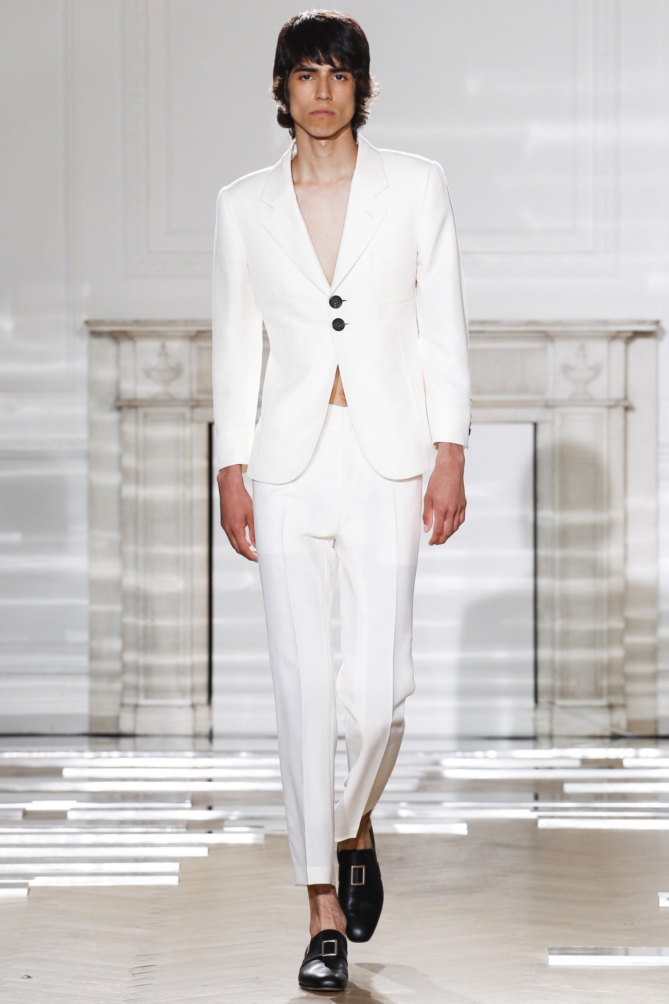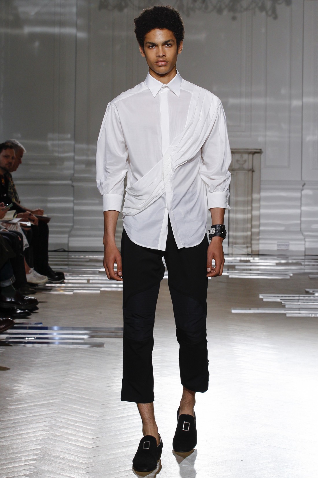 正是因为这种推小车式的力荐,让前几季还只是作为Fashion East孵化器下初试啼声的Grace Wales Bonner在本季正式走上了伦敦男装周的大舞台。2017春夏系列男装是她出道以来第五个系列,名为“Ezekie”(以西结,圣经记载的一位先知)。和Criag Green刚刚发布的童子军系列一样,Grace Wales Bonner的新作更像是对前期作品的一次完善与更新,可谓是根据过往而升级的“2.0”版本:总共22套新装保持了她将牙买加、加勒比,非洲糅合欧洲宫廷元素的做法,统治埃塞俄比亚长达44年之久的海尔塞拉西的历史照片同样悬挂在本季的灵感板上,并化身为缀有珠宝的无领夹克、迷你斗篷,高腰七分裤,天鹅绒裤式套装等精致单品。此外,女模特的出现,一方面象征了中性化的做法,一方面也是因为像Opening Ceremony这样从前两季便订货的零售商一直将其产品归类为女装试水,所以这次便索性干脆推出女装。