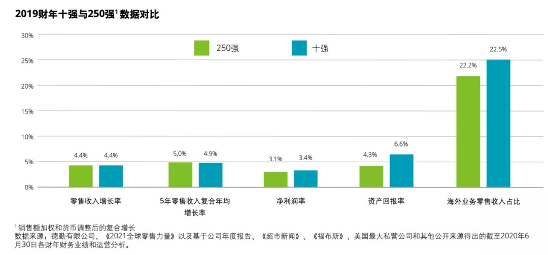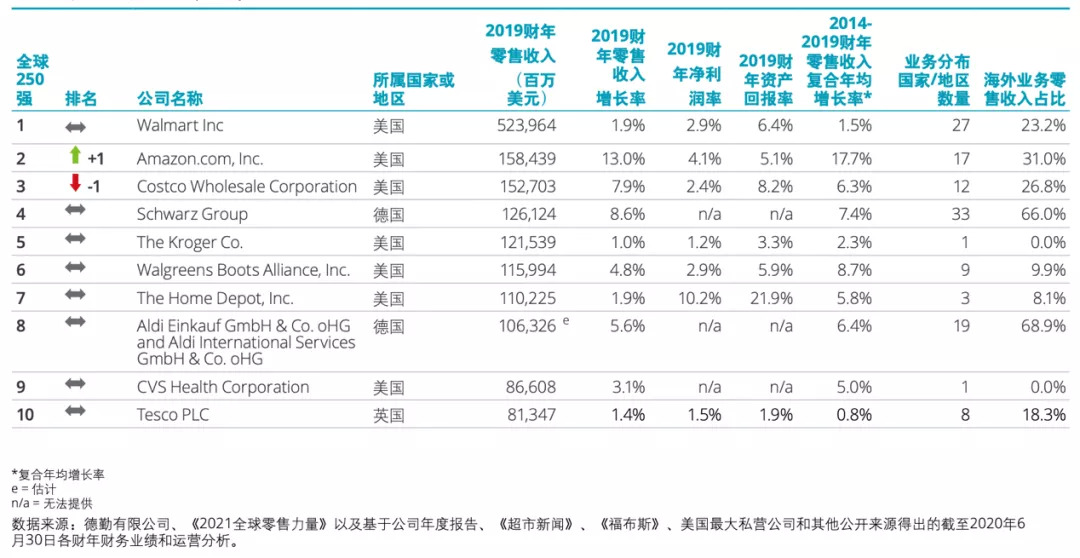按销售额加权和货币调整后的复合增长计算,2019财年十强的零售收入增长率同比下降1.9个百分点至4.4%,与250强持平,十强中仅Amazon实现了两位数的收入增长。