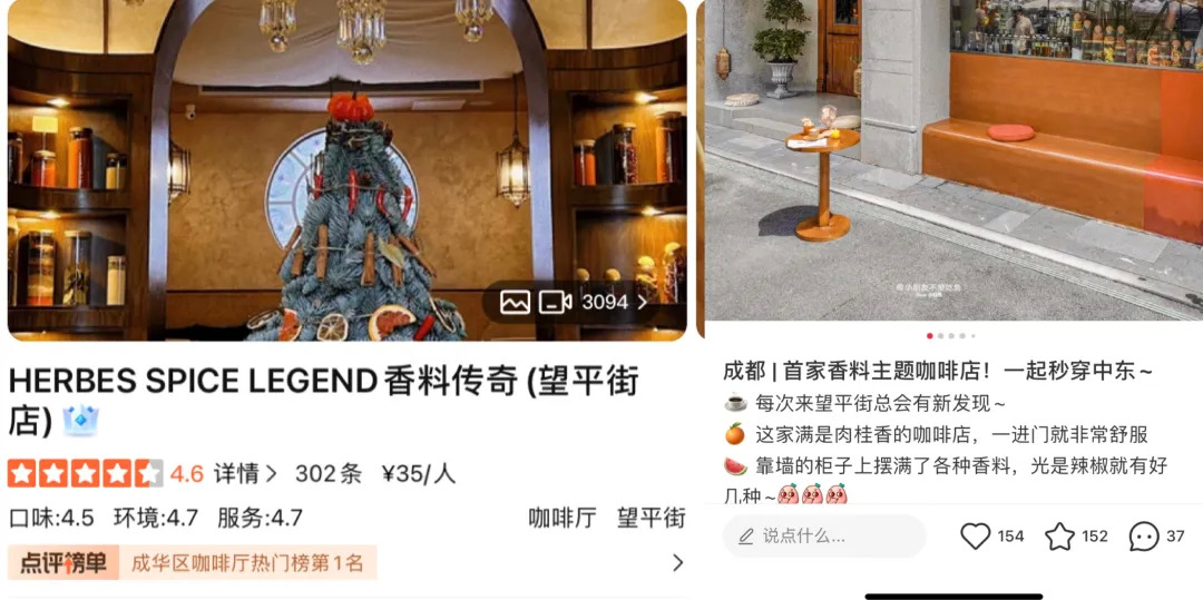 最近,成都有家叫HERBES SPICE LEGEND香料传奇的店,因产品多是香料+咖啡的创意搭配,被小红书用户称为“一秒穿越中东”,已经做到成华区咖啡厅热门榜一。