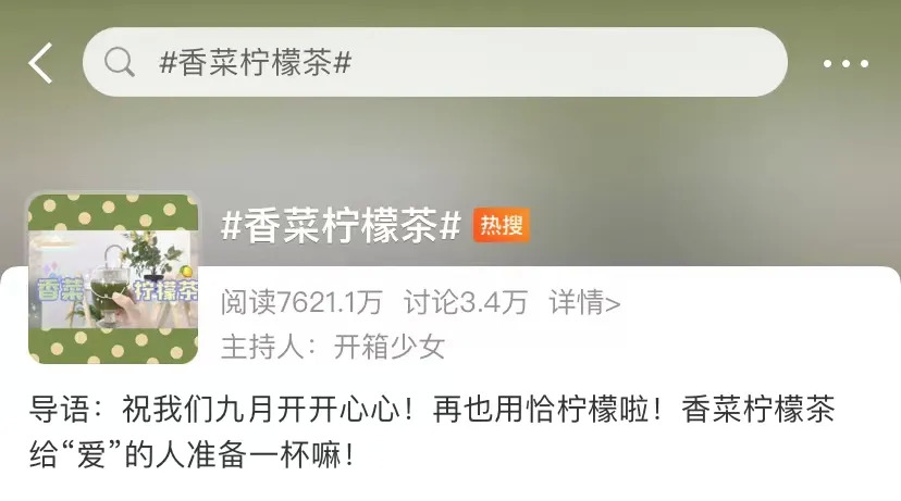 比如夏天柠檬茶成为爆款时,王柠、林香柠等多个品牌,都在上香菜柠檬茶,微博上也有“香菜柠檬茶”的话题,阅读量达到7621万,3.4万讨论。