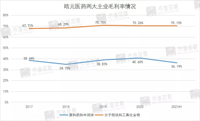 单纯以原料药生产为主的CMO企业潜力受限,受集采影响很大。皓元医药原料药和中间体产品中,替格瑞洛、阿哌沙班、托法替尼三个品种纳入第三批集采,今年上半年集采落地,虽然企业原料药和中间体同比收入增速达到了95.81%,但毛利率却比2020年下降了4.41个百分点。