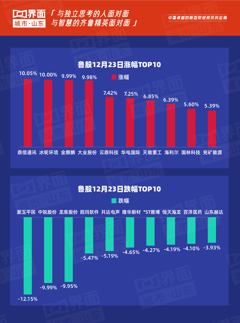 12月23日,山东80只股上涨,176只股下跌,5只股持平。总市值过千亿的有万华化学(600309)、海尔智家(600690)、青岛啤酒(600600)、潍柴动力(000338)、歌尔股份(002241)、中航沈飞(600760)、兖矿能源(600188)共7家,500亿-1000亿的共有7家,分别是、华熙生物(688363)、中泰证券(600918)、山东黄金(600547)、华鲁恒升(600426)、 联泓新科(003022)、玲珑轮胎(601966)、南山铝业(600219),浪潮信息(000977)、华电国际(600027)截至收盘个股股价最高为石大胜华(603026),收于195.18元;最低为山东钢铁(600022),收于1.86元。