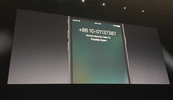 另外,iPhone来电界面可以自动识别来电身份了。根据现场的演示画面,一个区号为北京的座机标记为疑似广告电话。这个识别系统的数据来源方显示的是腾讯公司。