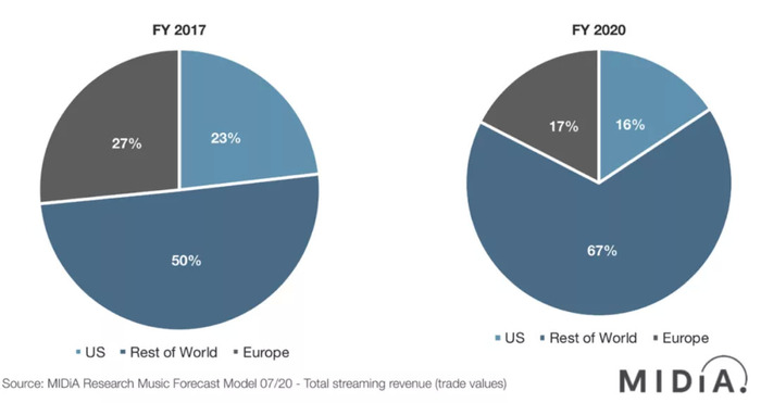 近几年,拉丁美洲、非洲、中东地区强势崛起,据《Global Music Report 2021》统计,2020年中东和北非地区唱片收入增长了37.8%,流媒体收入增长36.4%,拉丁美洲的唱片收入也增长了15.9%。在这些快速增长的地区冲击下,欧美的音乐市场主导地位正在转移,《MENA Music Market Opportunity》显示,2017年-2020年间,北美和欧洲的流媒体市场份额之和已由50%降至33%。