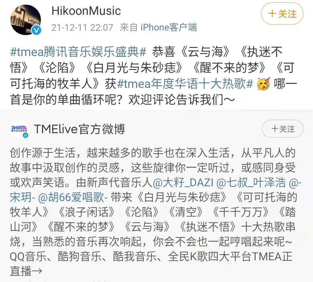 在国内,海葵音乐素有“爆款制造机”的称号。在前不久的TMEA腾讯音乐娱乐盛典中,它可谓是最大赢家,不仅旗下艺人王靖雯、安苏羽分别斩获“年度突破音乐人”、“年度最具影响力音乐人”奖项,更是将“年度华语十大热歌”中的6首收入囊中。