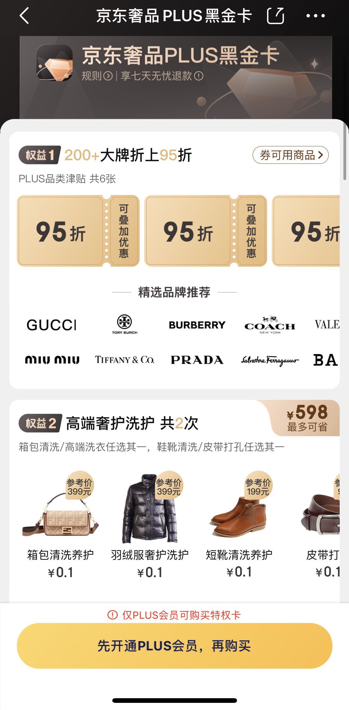 值得注意的是,京东也推出了自营的奢品养护服务。其优势在于无论品牌来来去去,京东都可以在消费者端保证统一的售后体验。而这也成为京东奢品发力会员体系的助力。在京东奢品PLUS黑金卡中,两次高端奢护洗护被列为会员可以享受的权益之一。