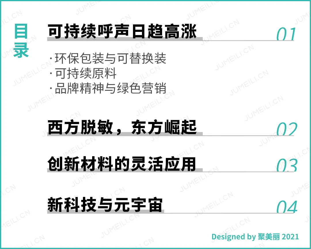 对此,聚美丽记者从中摘取了部分趋势进行详细介绍,并邀请了一些品牌与设计师对不同的趋势进行讨论。比如对于失衡感这一趋势具体以可持续发展为切入介绍大集团和新品牌的环保举措;对于我族导向这一趋势主要从非遗和国风为出发点介绍东方文化在品牌内容和产品上的应用;对于数字后人类这一趋势,对NFT、3D打印为代表的技术和趋势进行介绍;此外,文章还加入了部分对创新材料运用与展望的内容。