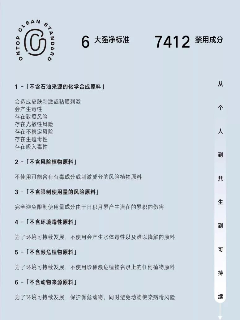另外,今年刚上线的纯净护肤品牌onTop综合国内外禁用成分清单,制定了一份严格的禁用成分清单和清晰的纯净标准。在中国可用原料白名单的基础上,onTop根据专家组对原料的评审意见,以及原料的来源和生产工艺等,筛选出了2850种风险成分+4562种禁用成分。