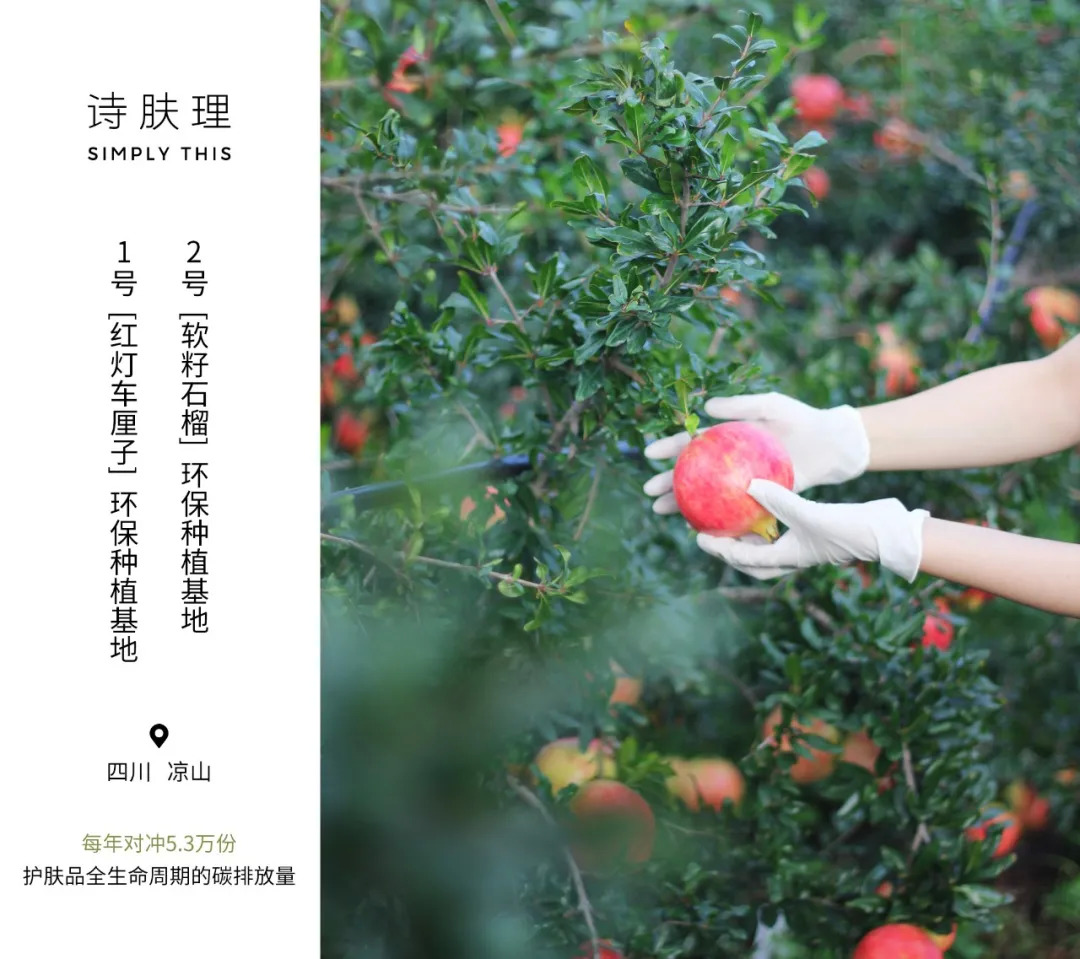 而护肤品牌诗肤理Simply This也创造性地提出“零碳计划”,在国内持续植树造林,推动以种植林木的方式对冲生产过程中的CO2排放,目前在四川凉山已经参与了退耕还林的车厘子和石榴果园两个项目。