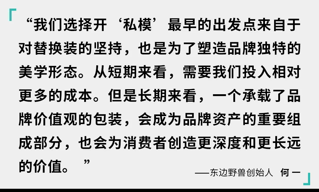 以刚上线的东边野兽举例,品牌落地便坚持公平可持续的开发原则,将大理石材料的边角料回收打造成产品包装。同时品牌推出了替换芯模式。在承载内容物的替换芯上做到用料最低化,且包装可进入循环回收系统。外壳采用家居耐用品标准工艺,减少护肤品容器用完即弃带来的环境压力。