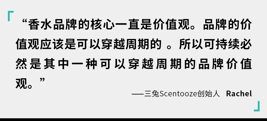 三兔Scentooze创始人Rachel也赞同道:“我觉得中国文化的挖掘和普及才刚刚开始,大家对于了解和学习和用更新的方式去讲中国文化这件事也刚刚开始,至于‘国风’和‘非遗’是个代表。我们发现有很多用户看我们的内容去了解更多传统文化,这也是我们做这个系列的初心。我们以传统香文化为引子切入,找到了国人可能对于气味感知的一些共同点,加上年轻人对传统文化的日益好奇和自豪,让他们更愿意倾听和了解背后的文化和由此而来的进一步的创造创新。未来我们会继续结合历史的传承创新,致力于在中国故事/中国情感的基础上,赋予香水新时代的精神内核。”