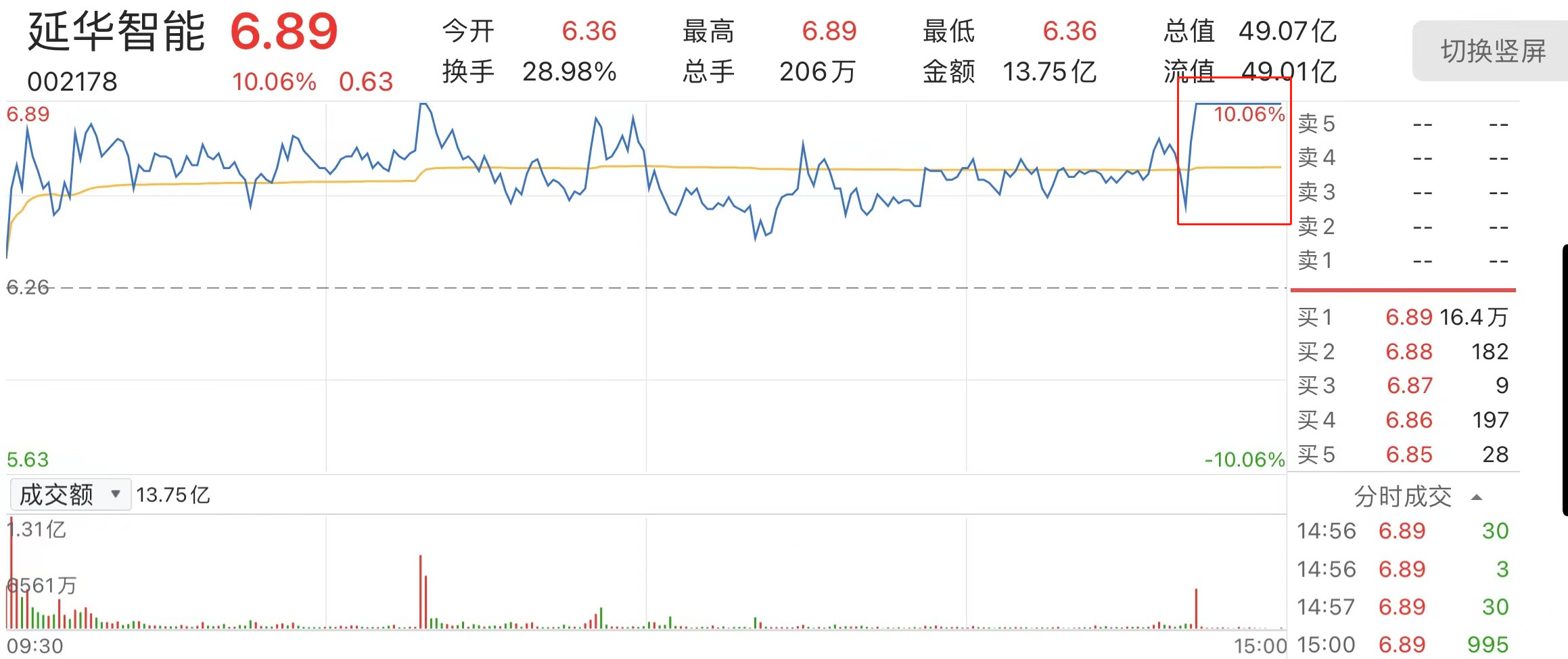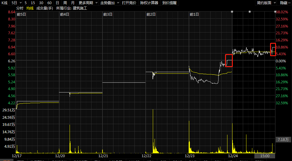 12月24日,延华智能(002178.SZ)以6.36元/股高位开盘,其后股价持续拉升,到下午14时43分左右终于拉升至6.89元/股并触及涨停板,最终该股票以10.06%涨停收盘。