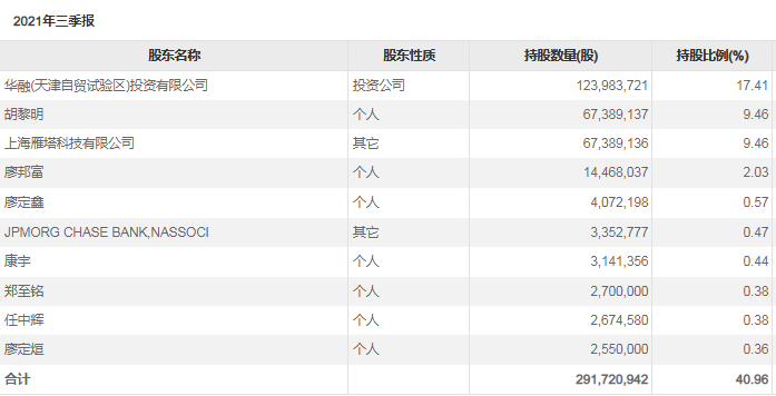 目前,延华智能仍是无实际控制人、无控股股东的公司。2021年第三季度报告显示,该公司截至今年9月30日的十大股东中,仅有第一大华融津投、第三大股东上海雁塔科技有限公司(简称“上海雁塔”)、第六大股东JPMORGCHASEBANK,NASSOCI为机构股东,其余皆为自然人个人股东;目前,前十大股东持有延华智能的股份占比高达40.96%。