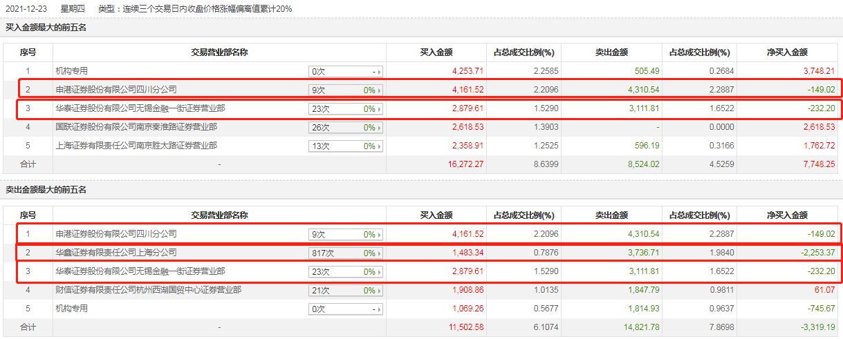 从龙虎榜来看,12月21日至23日三个交易日内,申港证券股份有限公司四川分公司以4161.52万元位居延华智能买入榜的第二名,同时以4310.54万元处于该公司卖出榜的第一名;华泰证券股份有限公司无锡金融一街证券营业部也是如此,其以2879.61万元局买入榜的第三名,但同时以3111.81万元处于卖出榜的第三名。