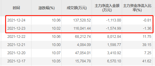 另据东方财富Choice数据显示,12月23日、24日,主力资金正在撤出延华智能,这两个交易日,在成交额增超10亿元的同时,主力净流出金额分别是1574.99万元、1113万元。